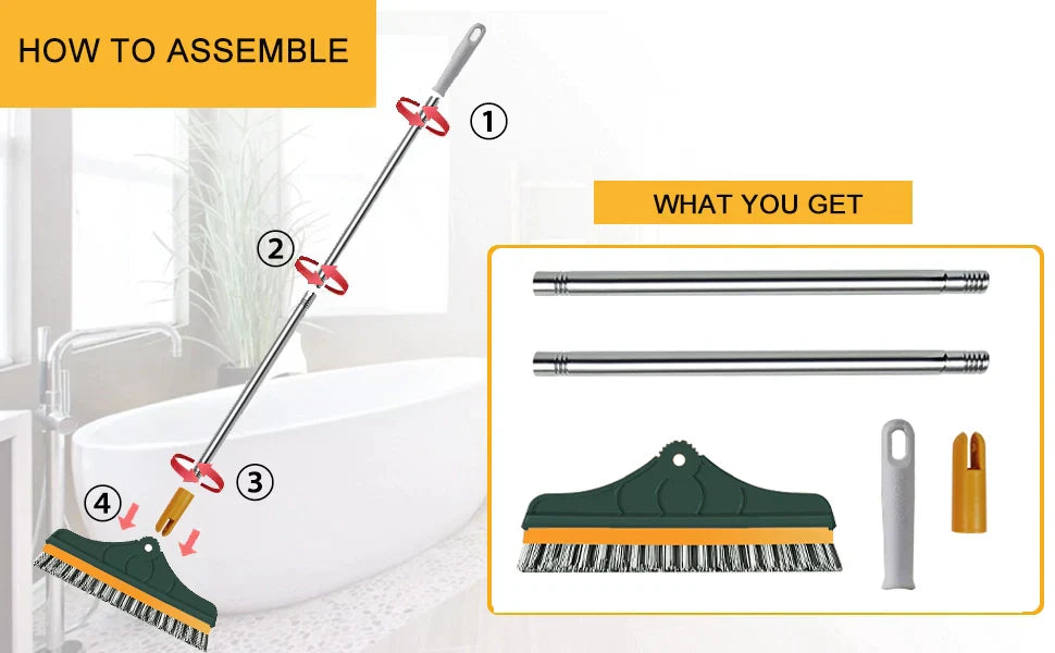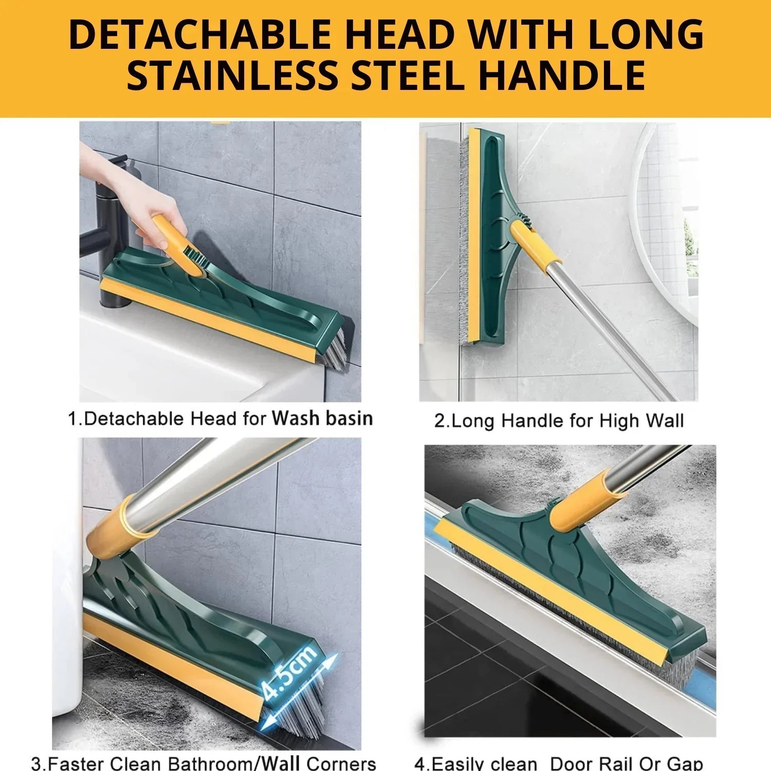 Introducing the superior 2-in-1 bathroom cleaning brush designed to revolutionize your cleaning routine. This innovative bathroom accessory combines the power of a floor scrub brush with the precision of a rubber squeegee wiper, making it your go-to tool for pristine bathroom and kitchen spaces.