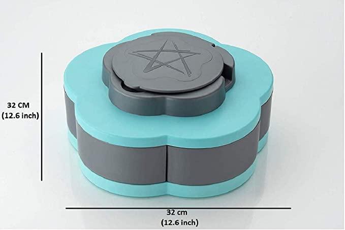 Product Name: 5 Compartments Flower Candy Box Serving Rotating Tray Dry Fruit 1 Piece Spice Set (Plastic, Green) Package Contains: It has 1 Piece of Candy Box Material: Plastic Color: As per Availability Combo/ Set Of: Pack of 1 Weight: 300 gm