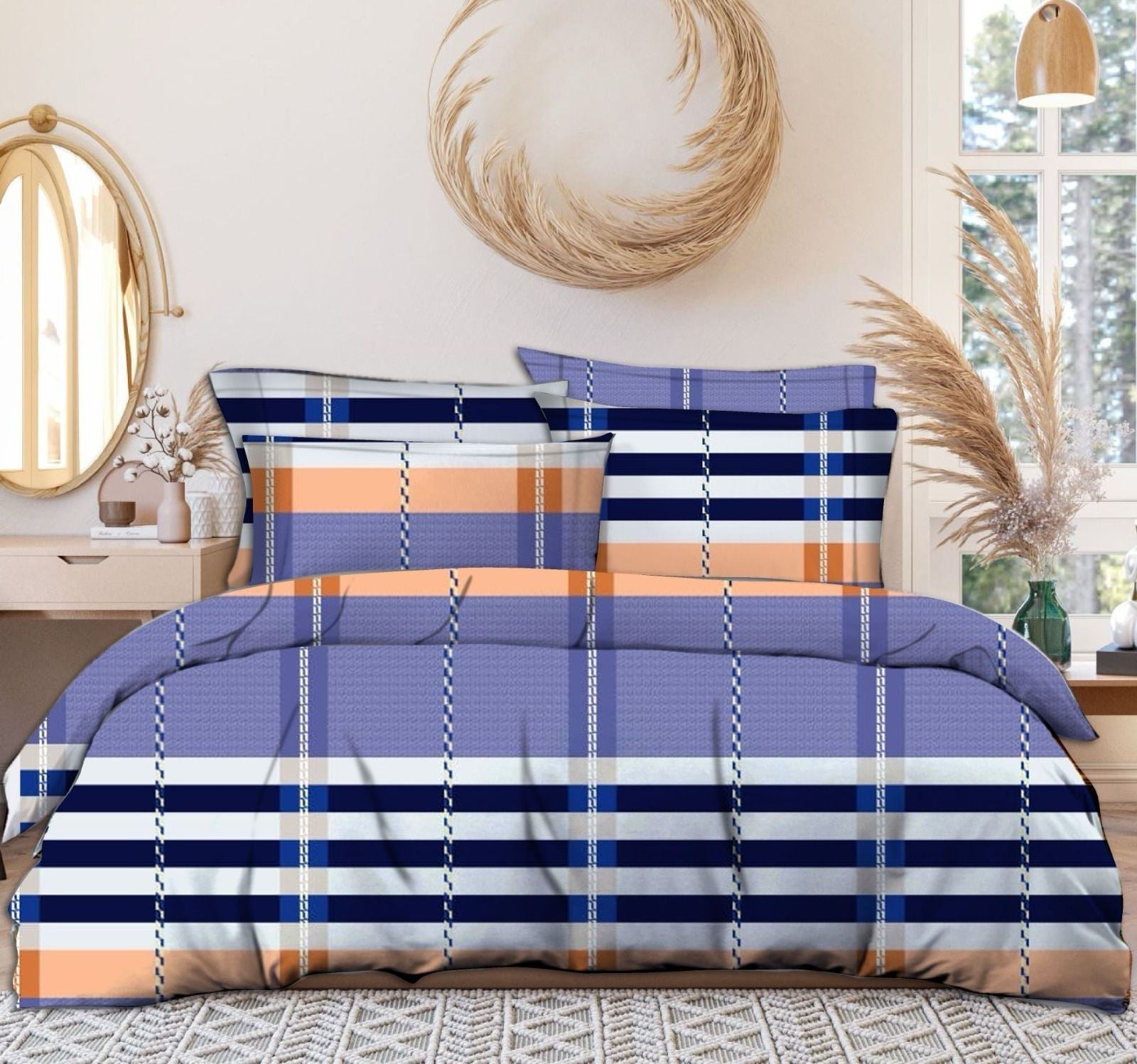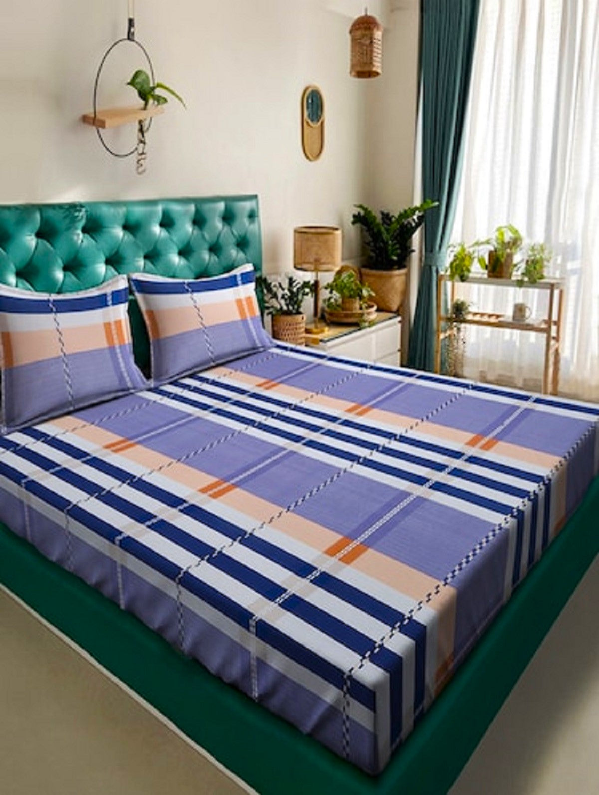 Blue Check King Size Double Bed Elastic Fitted Premium Bedsheet